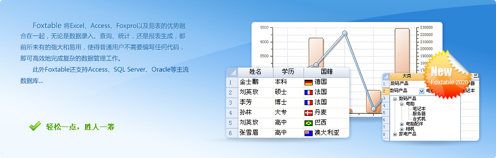 Foxtable將Excel、Access和Foxpro的優(yōu)勢(shì)融合在一起,并獨(dú)有層級(jí)數(shù)據(jù)管理功能,普通用戶不需要編寫(xiě)任何代碼,即可完成各種復(fù)雜的數(shù)據(jù)管理工作,真正做到拿來(lái)即用。